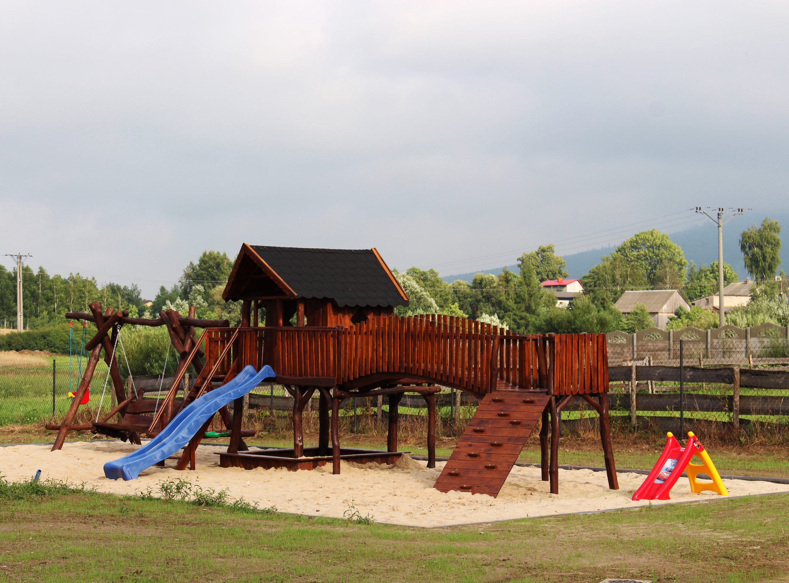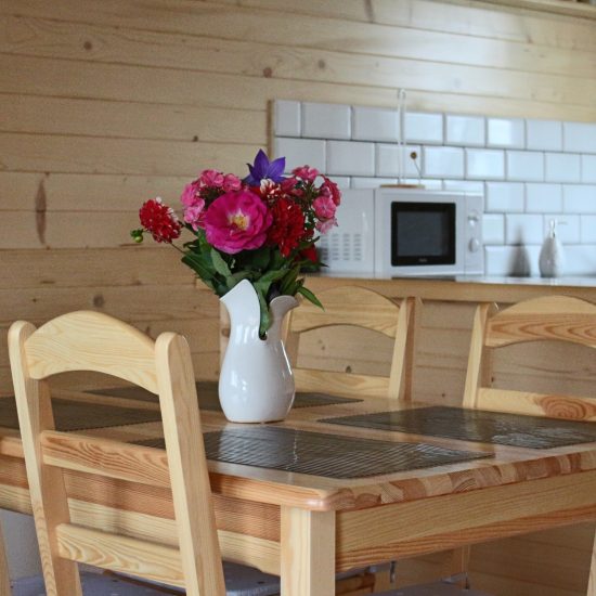 Zapraszamy do pięciu całorocznych, nastrojowych domków drewnianych z kominkiem, dużym tarasem oraz bajecznym widokiem na szczyty Gór Świętokrzyskich. Domki są 6- i 10-osobowe. W każdym domku na parterze znajdują się jadalnia i aneks kuchenny z pełnym wyposażeniem oraz kominek tworzący niepowtarzalną atmosferę. Salon wyposażony został w rozkładaną kanapę, stolik kawowy oraz TV. Do dyspozycji gości również bezprzewodowy Internet. Działka, na której położone są domki posiada bezpośredni dostęp do „dzikiej” części zalewu (miejsce idealne dla wędkarzy), do plaży 300 metrów. Jest ona ogrodzona w związku z tym jest dużo bezpiecznej przestrzeni dla dzieci. Kwestia czworonogów ustalana jest indywidualnie.
