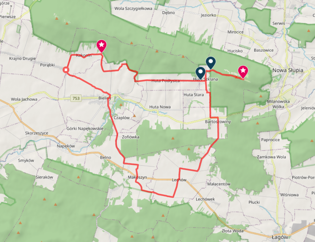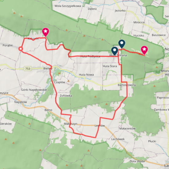 Kilometraż: Huta Szklana – Bartoszowiny (3,5km) – Lechów (5,5km) – Makoszyn (4,5km) – Bieliny (6km) – Porąbki Szkoła (3km) – Zagroda w Kakoninie (3km) – Huta Podłysica (6km) – Huta Szklana (2km) – Święty krzyż (3km).